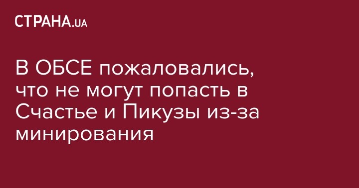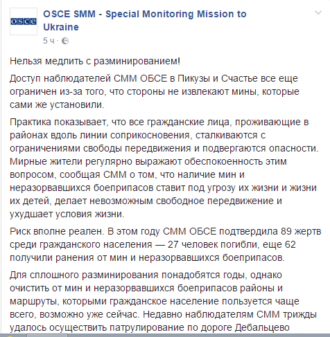 "Доступ наблюдателей СММ ОБСЕ в Пикузы и Счастье все еще ограничен из-за того, что стороны не изымают мины, которые сами же установили", - говорится в сообщении.