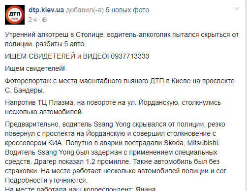 Попутно в ДТП пострадали Skoda и Mitsubishi. Водитель Ssang Yong был задержан с применением специальных средств. Драгер показал 1.2 промилле. Также автомобиль был без страховки.