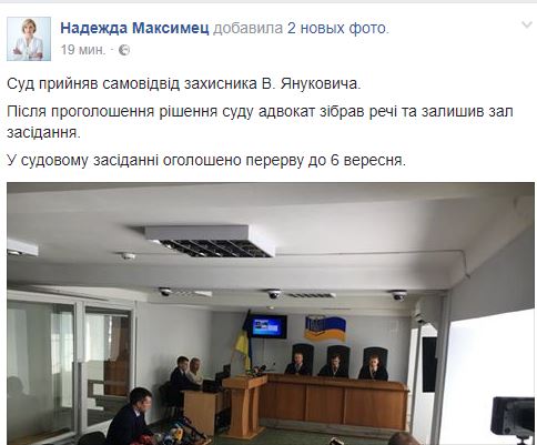 Суд принял самоотвод защитника Януковича. Об этом написала пресс-секретарь прокуратуры Киева Надежда Максимец на своей странице в Facebook.