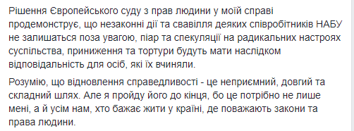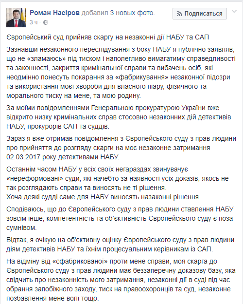 "Получил сообщение из Европейского суда по правам человека о принятии к рассмотрению жалобы на мое незаконное задержание 2 марта 2017 детективами НАБУ. Жду объективную оценку Европейского суда по правам человека действиям детективов НАБУ и их процессуальным руководителям из САП", - написал Насиров.