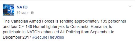 В Румынию отправились 135 военнослужащих Вооруженных сил Канады и 4 истребителя CF-18 Hornet Канадских королевских ВВС, который будут участвовать в боевом авиапатрулировании. Об этот сообщает пресс-служба НАТО.