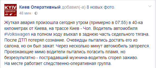 На трассе Киев - Чоп в 40 км от столицы сегодня утром, 18 августа, произошло жуткое ДТП, в котором погиб человек. Как сообщает "Киев Оперативный" в Facebook, легковушка Volkswagen столкнулась с седельным тягачом.