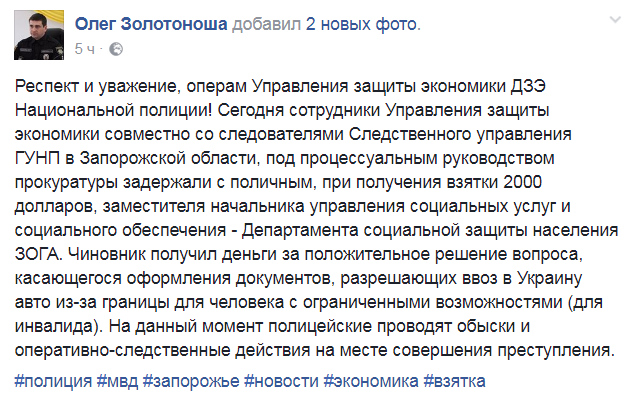 Об этом на Facebook-странице сообщил начальник Главного управления Национальной полиции Украины в Запорожской области Олег Золотоноша.