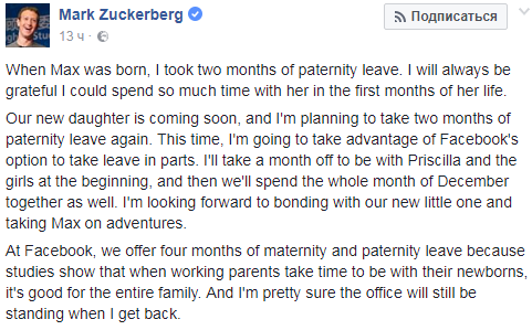 "В Facebook мы предоставляем четыре месяца декретного отпуска родителям, так как, согласно исследованиям, если работающие родители уделяют время новорожденным, это хорошо для всей семьи", - отметил Цукерберг.