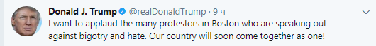 "Я хочу аплодировать многим протестующим в Бостоне, которые выступают против фанатизма и ненависти. Наша страна скоро будет едина", - написал президент США.