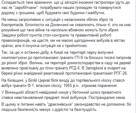 Заместитель главы Нацполиции Вячеслав Аброськин пожаловался в Facebook, что только за последние сутки полиция изъяла тысячу патронов и несколько гранат по всей Украине.
