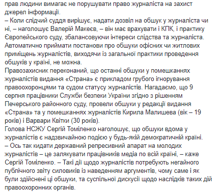 Конечно, силовики имеют право на следственные действия. Но обыски помещений журналистов без отчетности перед обществом об обоснованности таких действий - это давление. Опасный сигнал для всех журналистов", - написал глава НСЖУ.