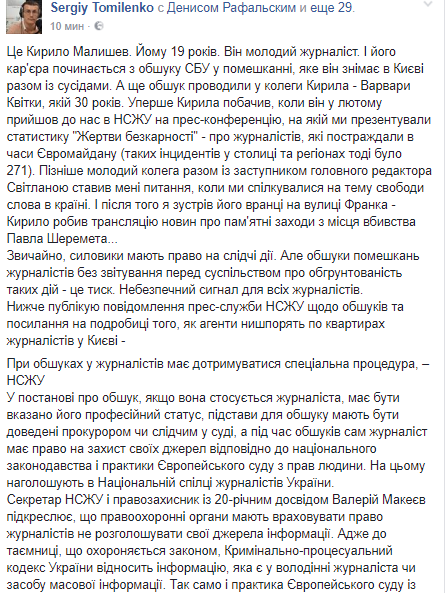 "Это Кирилл Малышев. Ему 19 лет. Он молодой журналист. И его карьера начинается с обыска СБУ в помещении, которое он снимает в Киеве вместе с соседями. А еще обыск проводили у коллеги Кирилла - Варвары Квитки, которой 30 лет. Впервые Кирилла увидел, когда он в феврале пришел к нам в НСЖУ на пресс-конференцию, на которой мы представили статистику о журналистах, пострадавших во время Евромайдана (таких инцидентов в столице и регионах тогда было 271). Позже молодой коллега вместе с заместителем главного редактора Светланой ставил мне вопросы, когда мы общались на тему свободы слова в стране. И после этого я встретил его утром на улице Франко - Кирилл делал трансляцию новостей о памятные мероприятия с места убийства Павла Шеремета ...