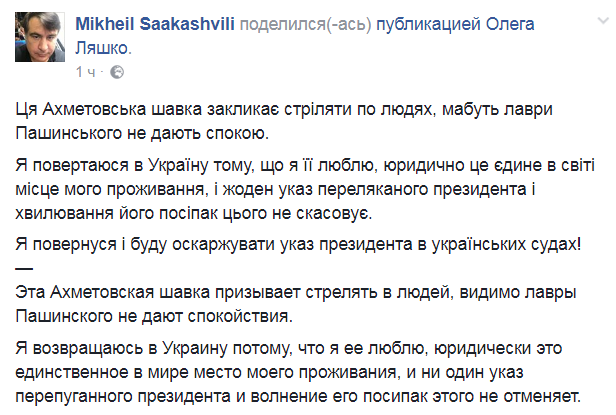 "Я возвращаюсь в Украину потому, что я ее люблю, юридически это единственное в мире место моего проживания, и ни один указ перепуганного президента и волнение его посипак этого не отменяет", - заявил Михаил Саакашвили.