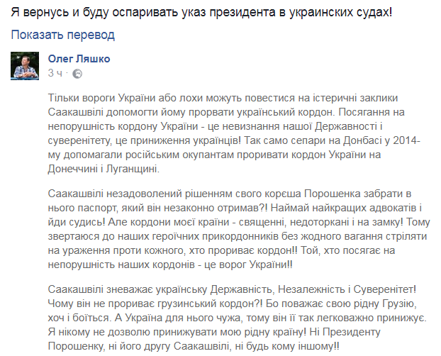 Собирающийся прорываться через западную границу Украины экс-президент Грузии и бывший губернатор Одесской области Михаил Саакашвили устроил Facebook-перепалку с "главрадикалом" Олегом Ляшко.
