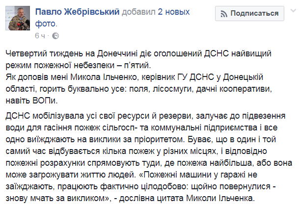 Об этом на Facebook-странице сообщил председатель Донецкой военно-гражданской администрации Павел Жебривский.