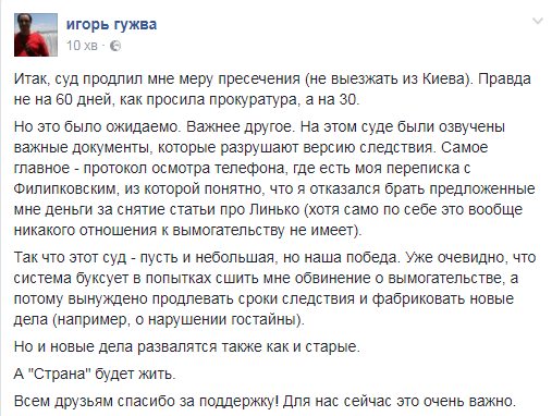 15.23 "Сегодня в суде прозвучали очень важные вещи. Так, из материалов следствия, четко следует, что я ничего не вымогал у нардепа Линько. И что я отказался брать предложенные мне деньги за снятие материала. Об этом говорит моя смс-переписка с Филипковским, где я четко заявил, что мы таким не занимаемся. Если б правоохранительные органы руководствовались бы исключительно нормами закона, то это дело было бы уже давно закрыто за отсутствием не только состава, но и самого факта преступления. Но это дело политическое и потому его, скорее всего, продолжат шить и дальше.Но только какими-то совсем уж глобальными фальсификациями может быть состряпано новое обвинение и передано в суд для вынесения приговора. Об этом говорят и последние обыски СБУ в редакции и в домах наших журналистов. Это просто вечный двигатель по фабрикации дел против "Страны", которая ведет информационную политику, не нравящуюся власти", - заявил Игорь Гужва.