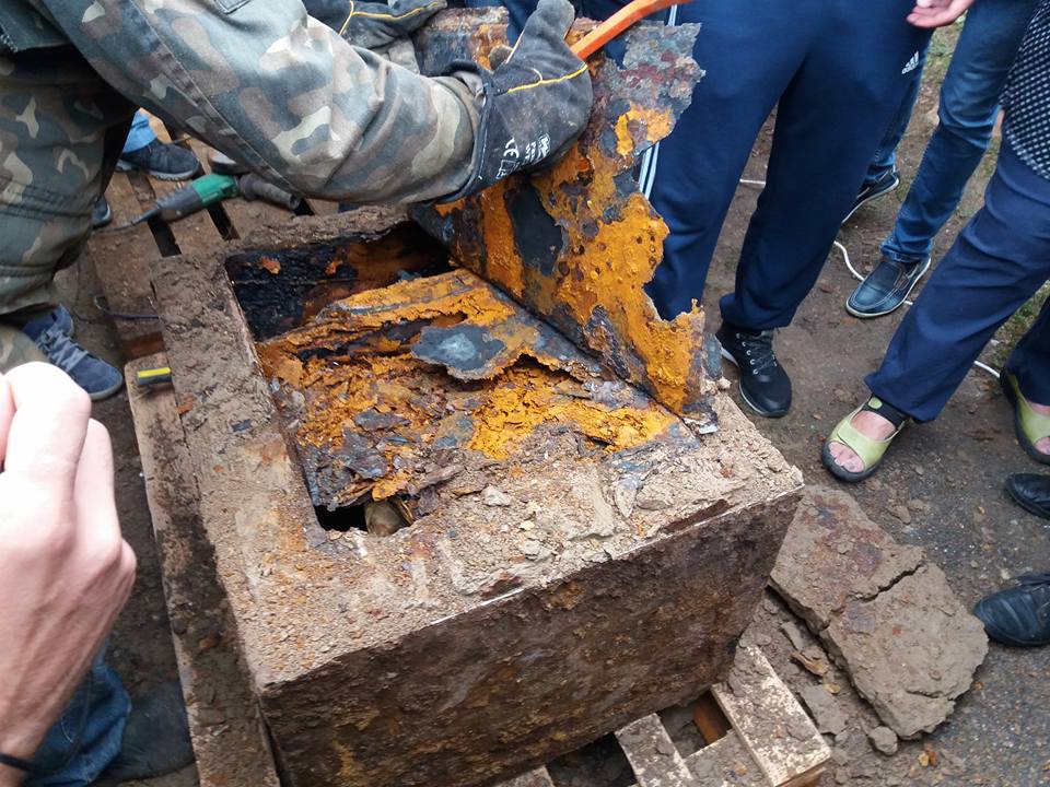 Отбросив прогнившую заднюю стенку, под ней обнаружили еще слой спрессованного влажного песка. После нескольких несильных ударов топором по металлу, в следующей стенке сейфа появились дыры и трещины. Но несмотря на надежды жителей города на золото, внутри сейфа оказались документы, часть из них на русском языке.