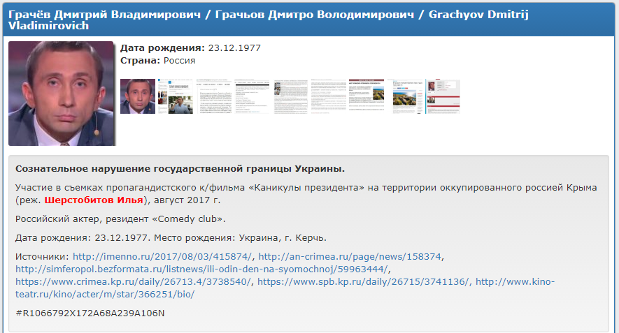 Грачев попал в базу данных из-за "сознательного нарушения государственной границы Украины", а также участия в съемках фильма "Каникулы президента" на территории Крыма в августе 2017 года.