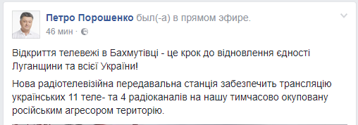 Президент Петр Порошенко открыл в Бахмутовке на подконтрольной Украине части Луганской области телебашю, которая по замыслу властей будет осуществлять вещание на Донбассе. Об этом говорится в Facebook президента.