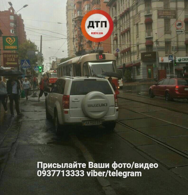 Во вторник, 22 августа 2017 в Киеве появился еще один "герой парковки". Водитель джипа Suzuki припарковался прямо на трамвайных путях, чем полностью заблокировал движение общественного транспорта.