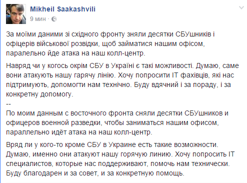 "По моим данным с восточного фронта сняли десятки СБУшников и офицеров военной разведки, чтобы заниматься нашим офисом, параллельно идет атака на наш колл-центр. Вряд ли у кого-то кроме СБУ в Украине есть такие возможности. Думаю, именно они атакуют нашу горячую линию. Хочу попросить IT специалистов, которые нас поддерживают, помочь нам технически. Буду благодарен и за совет, и за конкретную помощь", - написал Саакашвили.
