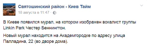 В Киеве нарисовали мурал с умершим музыкантом Linkin Park Беннингтоном