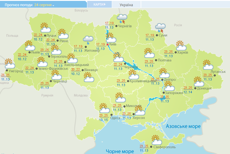 В Киеве, по данным Гидрометцентра, 24 августа будет солнечно, температура воздуха ночью около +11+13, днем +17+19.
