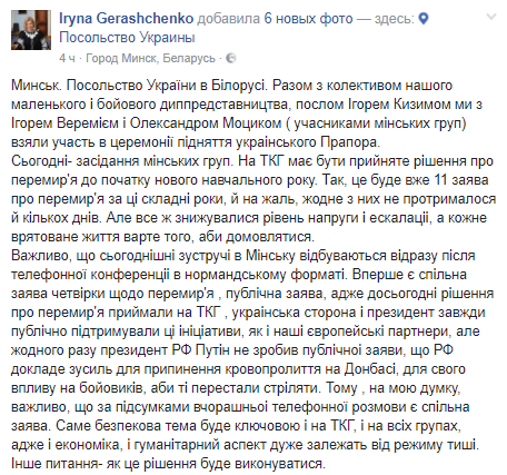 "Сегодня - заседание минских групп. На ТКГ должно быть принято решение о перемирии к началу нового учебного года. Так, это будет уже 11 заявление о перемирии за эти сложные годы, и к сожалению, ни одно из них не продержалось и нескольких дней. Но все же снижались уровень напряжения и эскалации, а каждая спасенная жизнь стоит того, чтобы договариваться", - сообщила представитель Украины в гуманитарной подгруппе контактной группы Ирина Геращенко.