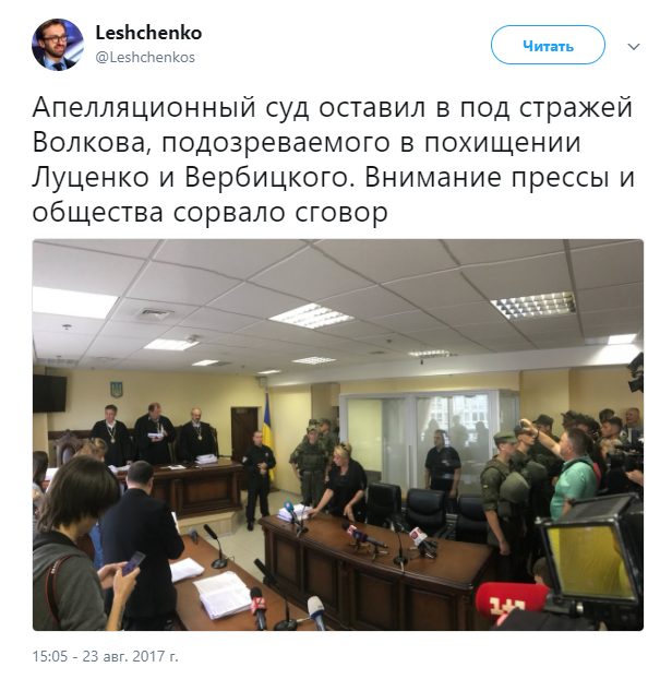 Сегодня, 23 августа, Апелляционный суд оставил в под стражей Волкова, подозреваемого в похищении Луценко и Вербицкого. Об этом сообщил нардеп Сергей Лещенко в своем Twitter.