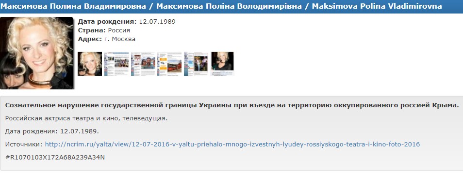 Российская актриса Полина Максимова, известная по телесериалу "Деффчонки", попала в чистилище "Миротворца" за посещение аннексированного Крыма. Ее профиль уже размещен на скандальном сайте.