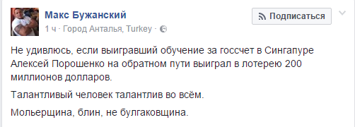 "Не удивлюсь, если выигравший обучение за госсчет в Сингапуре Алексей Порошенко на обратном пути выиграл в лотерею 200 миллионов долларов. Талантливый человек талантлив во всём. Мольерщина, блин, не булгаковщина", иронизирует блогер Макс Бужанский.