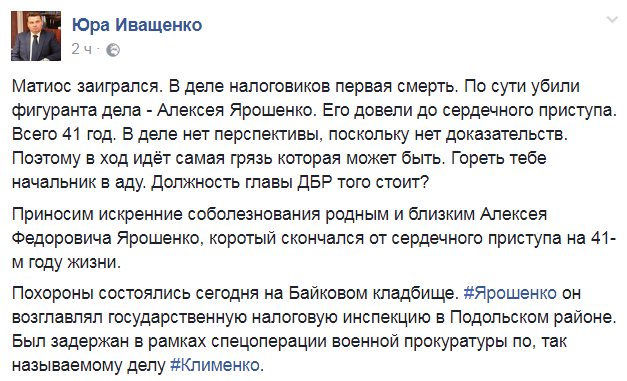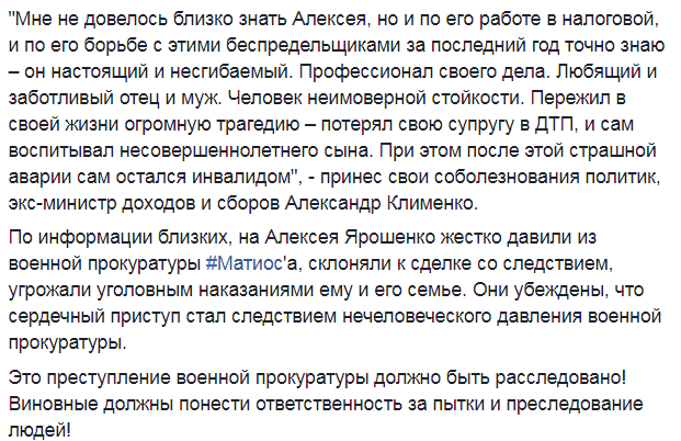 "По информации близких, на Алексея Ярошенко жестко давили из военной прокуратуры (возглавляемой Анатолием Матиосом - Прим.Ред.), склоняли к сделке со следствием, угрожали уголовным наказаниями ему и его семье. Они убеждены, что сердечный приступ стал следствием нечеловеческого давления военной прокуратуры", - написал Иващенко.