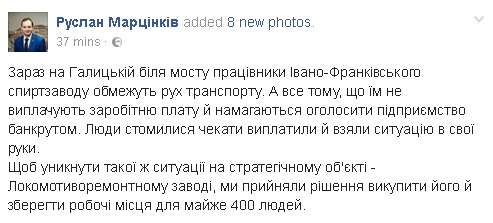 "Сейчас на Галицкой возле моста работники Ивано-Франковского спиртзавода ограничивают движение транспорта. А все потому, что им не выплачивают заработную плату и пытаются объявить предприятие банкротом. Люди устали ждать выплат и взяли ситуацию в свои руки. Чтобы избежать такой же ситуации на стратегическом объекте - Локомотиворемонтном заводе, мы приняли решение выкупить его и сохранить рабочие места почти для 400 человек", - отметил Марцинкив.