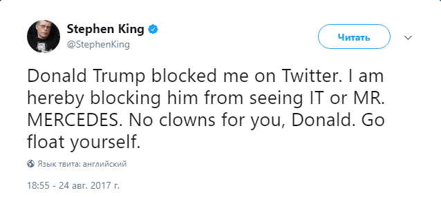 "Дональд Трамп заблокировал меня в Twitter. Я, таким образом, блокирую его от просмотра "Оно" и "Мистера Мерседеса". Никаких вам клоунов, Дональд", – заявил Кинг.