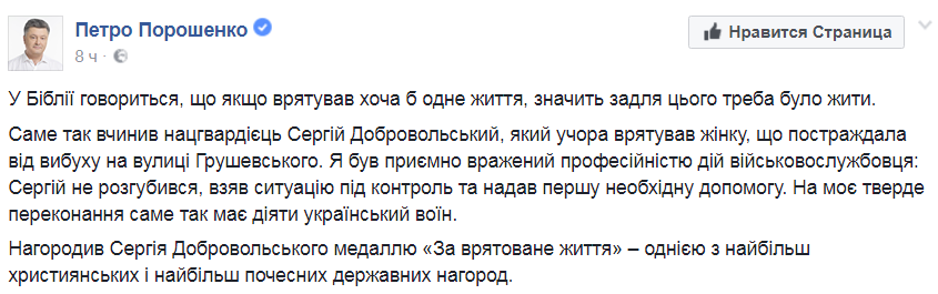 "Я был приятно впечатлен вашими профессиональными действиями во время преступления, который негодяи совершили против семьи Героя Украины. Вы не растерялись и взяли ситуацию под контроль и предоставили первую медицинскую помощь", - сказал Порошенко, подчеркнув, что именно так должен действовать настоящий украинский воин.