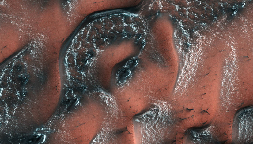 NASA обнародовало фото с Марса, на котором запечатлены дюны "красной планеты", покрытые снегом. Об этом сообщается на сайте космического агентства.