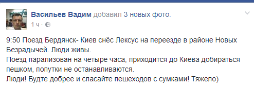 Также о ДТП с участием поезда и автомобиля Lexus сообщил один из пользователей соцсети Facebook. По его словам движение поезда остановлено на 4 часа.
