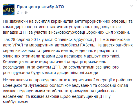 Как сообщает пресс-центр штаба АТО на странице в соцсети Fаcebook, ДТП произошло в понедельник, 28 августа 2017 года, в Славянске.