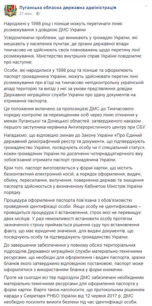 Рожденные в 1998 году и позже жители неподконтрольных территорий могут пересекать линию разграничения без паспорта, со справкой Государственной миграционной службы Украины. Об этом сообщает пресс-служба Луганской облгосадминистрации.