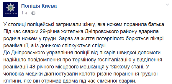 В Киеве женщина, в ходе ссоры, напала с ножом на своего отца. Ее задержали правоохранители. Пострадавшего госпитализировали в реанимацию. За его жизнь борются врачи.