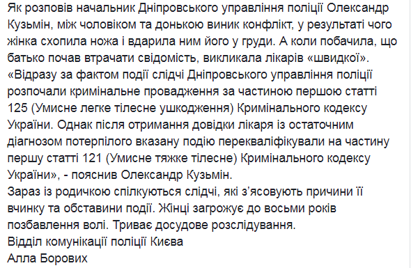 По факту происшествия следователи Днепровского управления полиции начали уголовное производство по части первой статьи 125 ("Умышленное легкое телесное повреждение") Уголовного кодекса Украины.
