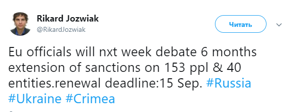 В ЕС на следующей неделе состоится обсуждение вопроса о необходимости продления санкций против 153 физических лиц и компаний из России. Об этом сообщил брюссельский журналист Рикард Йозвяк на своей странице в Twitter.