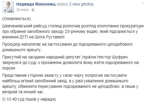 "Прокурор настаивает на применении к подозреваемому круглосуточного домашнего ареста", - написала она.