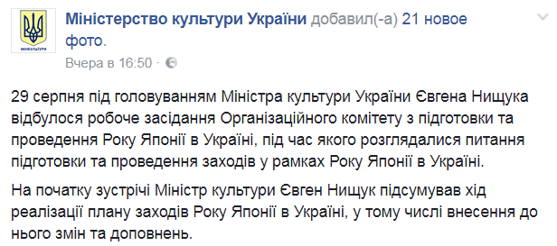 Об этом сообщается на Facebook-странице Министерства культуры Украины.