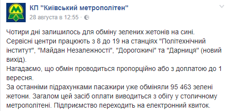 В четверг, 31 августа, последний день, когда в киевском метро можно обменять старые зеленые жетоны на новые синие. Об этом в Facebook напоминает "Киевметрополитен".