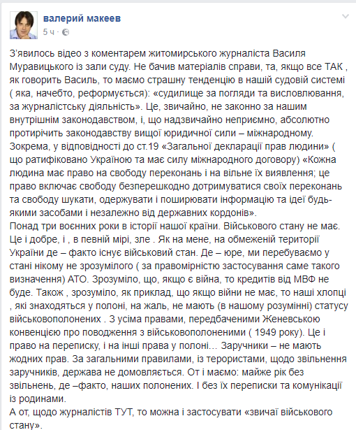 Он говорит, что если житомирского журналиста Василия Муравицкого действительно судят исключительно за позицию в его материалах, как считает сам Муравицкий, то появляется тенденция в нашей судебной системе: "судилище за взгляды и высказывания, за журналистскую деятельность".