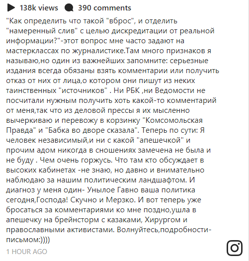 "Теперь по сути: Я человек независимый,и ни с какой "апешечкой" и прочим адом никогда в сношениях замечена не была и не буду. Чем очень горжусь. Что там кто обсуждает в высоких кабинетах - не знаю, но давно и внимательно наблюдаю за нашим политическим ландшафтом. И диагноз у меня один - Унылое Гавно ваша политика сегодня, Господа! Скучно и Мерзко. И вот теперь уже бросаться за комментариями ко мне поздно, ушла в апешечку на брейнсторм с казаками, Хирургом и православными активистами. Волнуйтесь, подробности-письмом", - написала она.