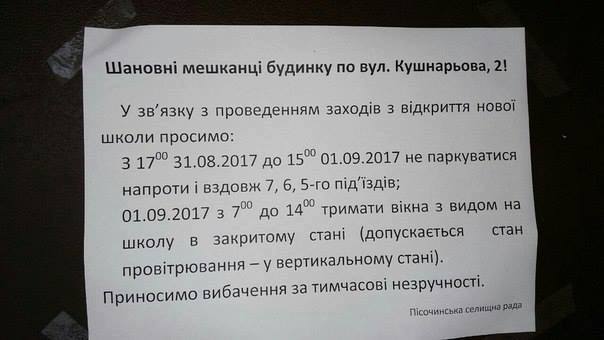 "Харьков проспект Тракторостроителей, 95, девятиэтажка. Район детской поликлиники №13" Такое объявление: "Уважаемые жильцы! Просьба не выходить на балконы и закрыть окна с 11.00 до 15.00 - 01.09.2017 года. Будет работать охрана президента", - написано на листовках в подъездах.