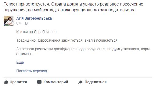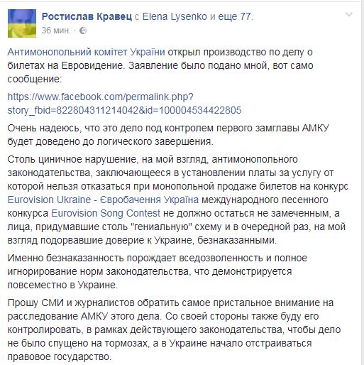 "Антимонопольный комитет Украины открыл производство по делу о билетах на Евровидение. Заявление было подано мной", - сообщает Кравец.