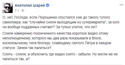 Видеоблогер Анатолий Шарий считает, что видео постановочное и недоумевает - на кого расчитан такой низкопробный пиар: "Если Порошенко опустился уже до такого тупого самопиара, как "случайно сняли выходящим из супермаркета", за кого он вообще подданных считает? За тупых улиток, что ли?".