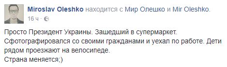 "Просто Президент Украины. Зашедший в супермаркет. Сфотографировался со своими гражданами и уехал по работе. Дети рядом проезжают на велосипеде. Страна меняется;)", - радостно сообщил Олешко в Facebook.