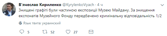 Он написал, что уничтоженные граффити были частью экспозиции Музея Майдана, и за уничтожение музейного фонда предусмотрена уголовная ответственность.