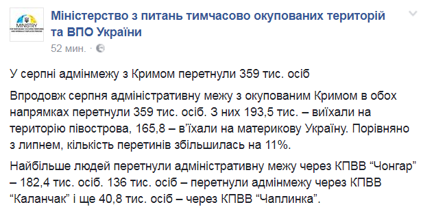 В течение августа 2017 года административную границу на въезд в аннексированный Крым пересекли 193 500 человек. В совокупности, число пересечений граница на въезд\выезд, по сравнению с июлем, выросло на 11%.