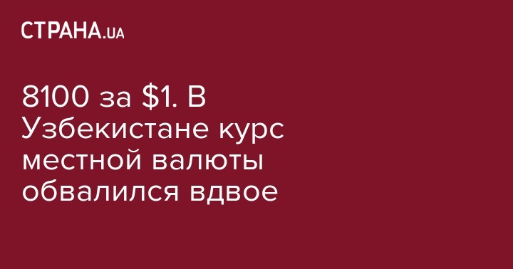 В понедельник, 4 сентября в Центробанке (ЦБ) Узбекистана практически вдвое "удешевили" национальную валюту - узбекский сум. Его новый курс, на вторник 5 сентября 2017 установлен уровне 8100 сумов за $1. Об этом сообщили в пресс-службе узбекского ЦБ.